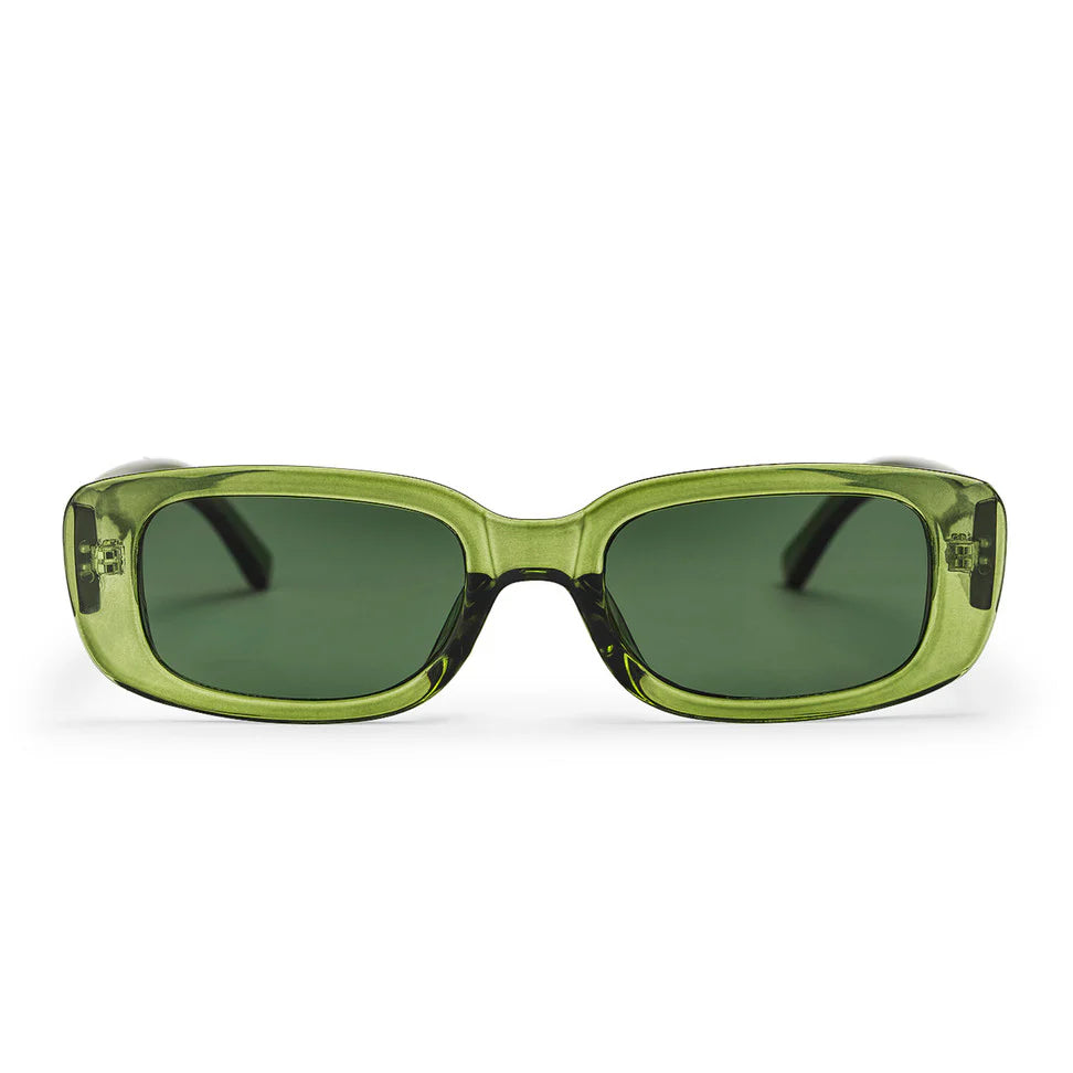 A forest green frame made from 100% recycled plastic combined with a green lens.