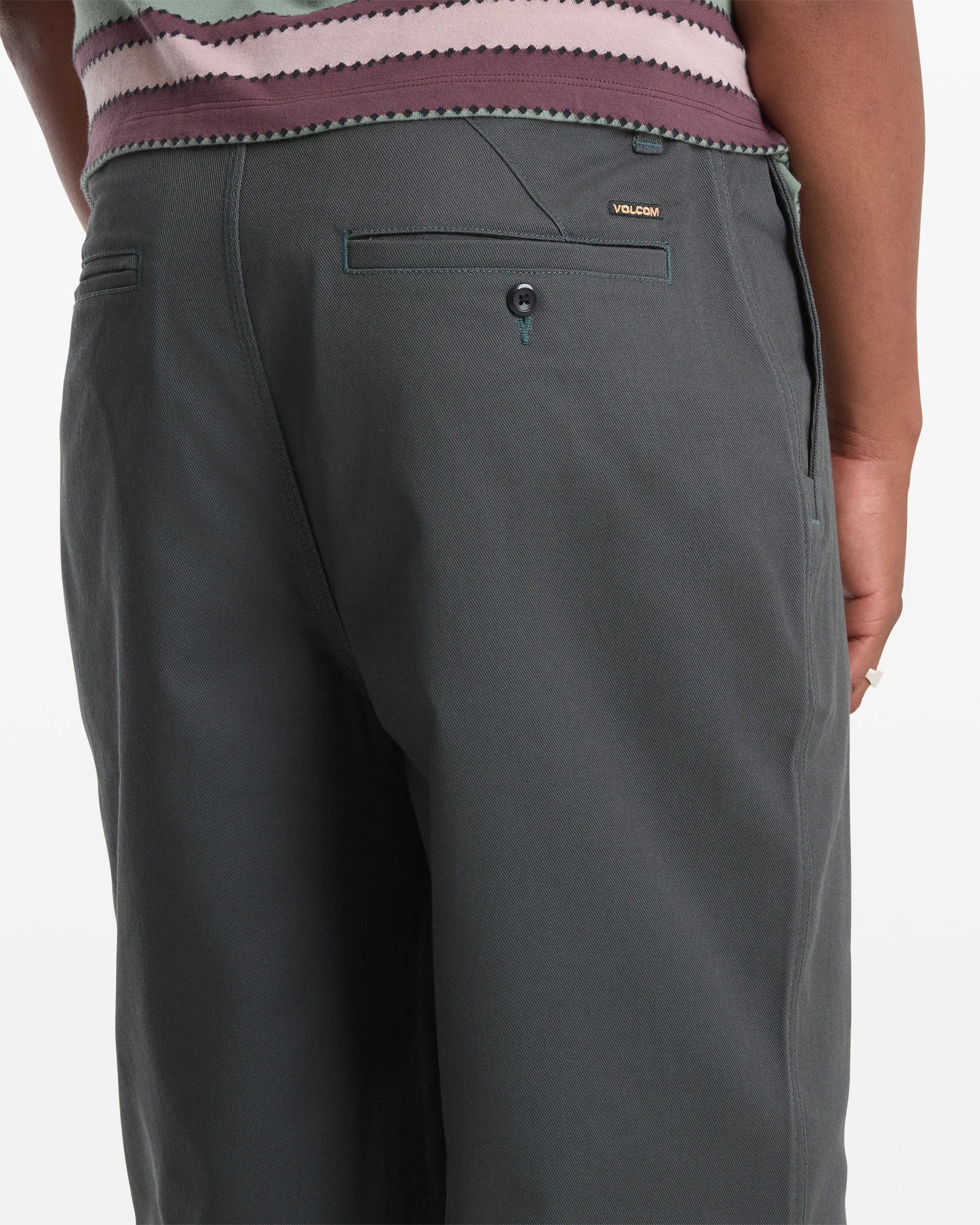 - Volcom woven label above wearer's back right welt pocket, the back left pocket is a split pocket