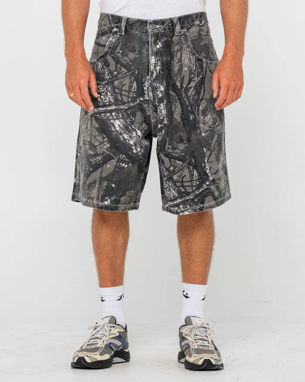 Baggy Fit Short With All Over Camo Print And Rusty Life Cycle Embroidery. 100% Cotton Camo